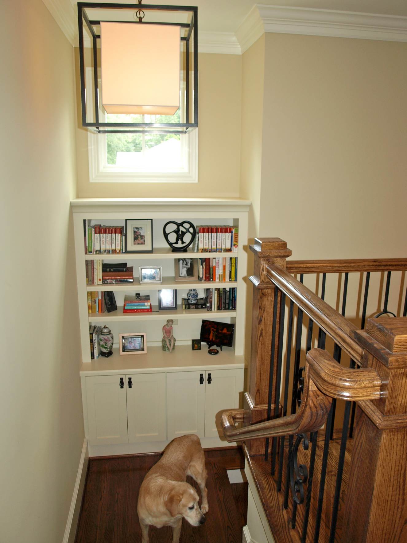 - Book shelf tucked into space at the landing. The window above keeps the stairway brightly lit.