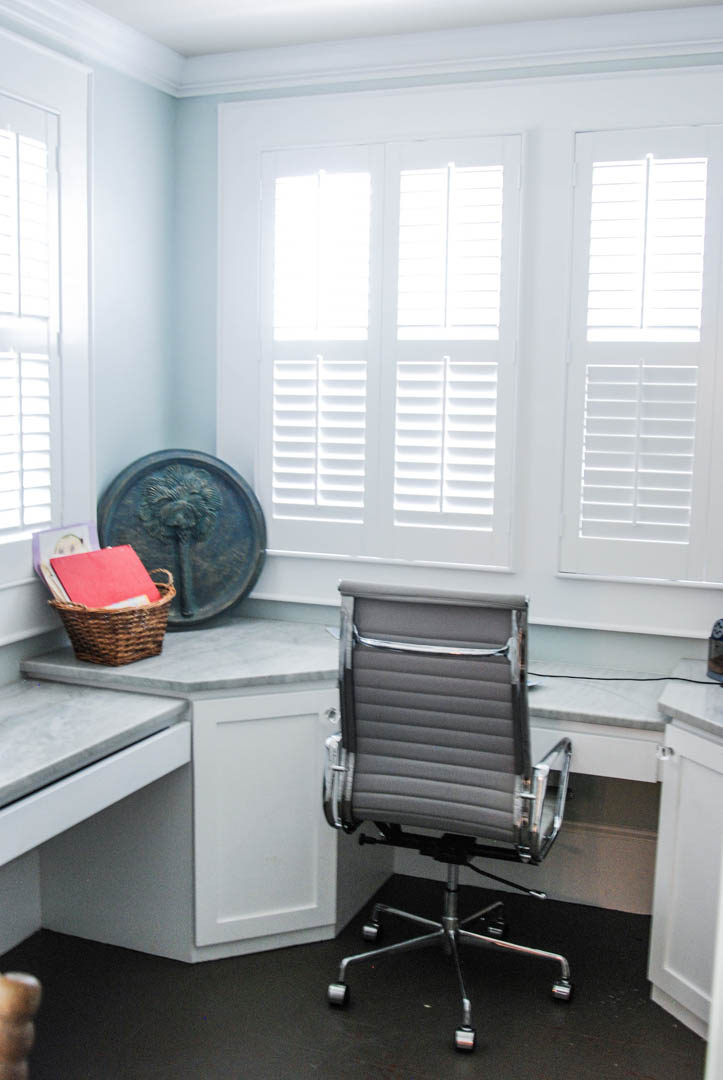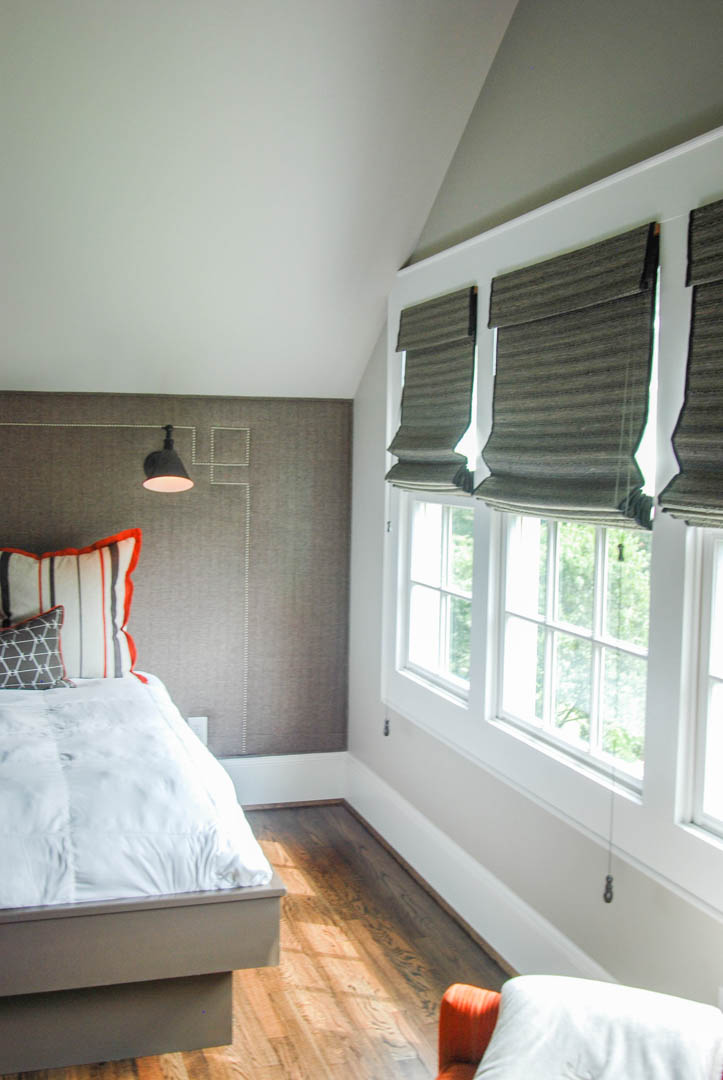 A wall full of windows with Bermuda shutters allows for a lot of natural light while retaining privacy. The area of the built-in headboard formerly was the door to the bedroom that was shared by both the boys and led into the main hall.