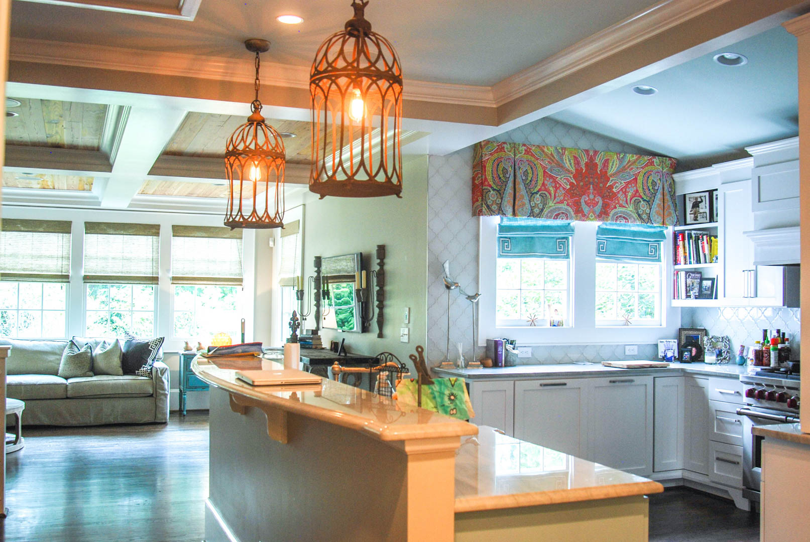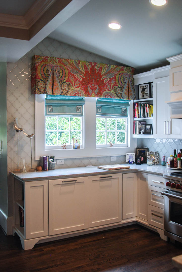 The ceiling jumps up to follow the roofline and two large windows are put in the left side of the kitchen to allow for lots of natural light. The back wall is tiled with robin’s egg blue, white and grey that makes the wall shine where ever you look.