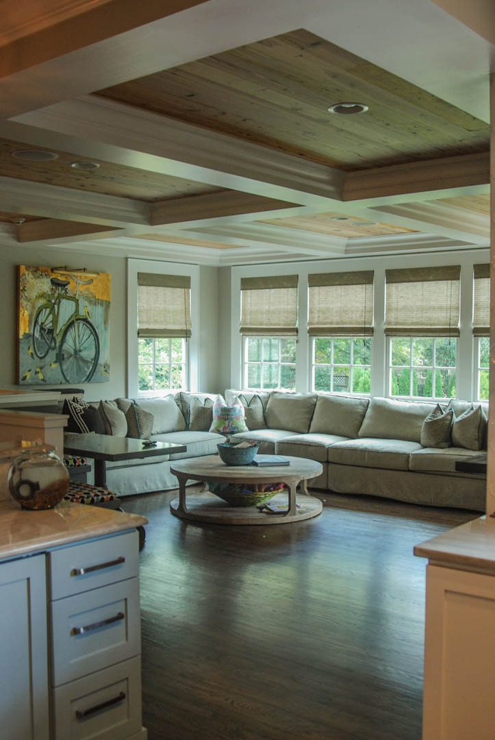A huge wall of windows line the back of the added family room, drawing the eye outside. Intensifying the drama, ceiling coffers add terrific detail.