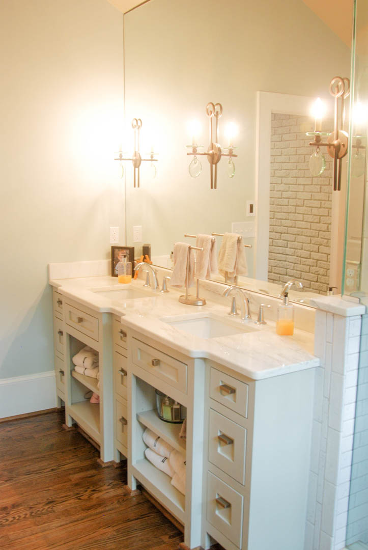 A double vanity and extra cabinet space for the girl’s wing adds much needed room in the bathroom the girls share.