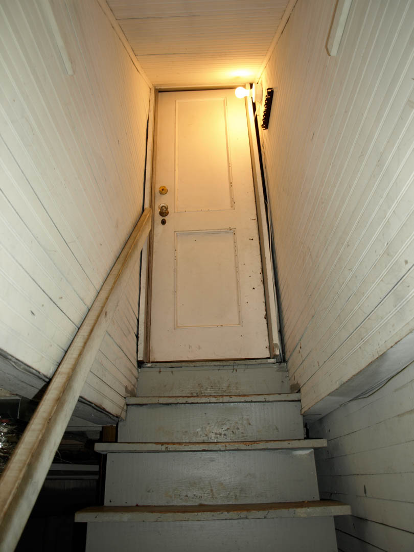 A built-in banquette lines the staircase leading to the basement.